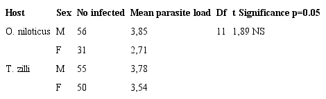Statistical analysis: The relationship that exists between the parasite burden and other tested variables (length, weight and sex) were compared using correlation analysis and t-test. P-values equal to or less than 0,05 were considered significant (Steel & Torrie, 1980).
