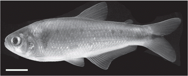 Color in alcohol. Body dark brownish-yellow, chro-matophores more densely concentrated on dorsum, most intense on head and extending to anterior part of dentary. Midlateral body with dark stripe from posterior margin of eye, interrupted at humeral spot and then con tinuing posteriorly onto middle caudal-fin rays. Humeral spot vertically elongate, located near posterior margin of opercle, extending from second to fifth scale of lat eral line series and extending three to five scale rows below the lateral line series. Ventral part of body light yellow. Posterior margin of scales on dorsal region of body dark. Dorsal and anal fin with strong concentration of chromatophores along distal margin. Adipose dark brown. Caudal-fin with dark chromatophores on middle rays. Pectoral and pelvic fins as well as caudal-fin lobes hyaline. Dorsal fin with chromatophores concentrated mostly on interradial membranes and distal margins of anterior rays.