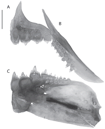 Premaxilla with two rows of teeth, outer row with four to five tricuspid teeth; internal row with four, the first three pentacuspid and the last tricuspid, diminish ing gradually in size laterally. Maxilla extends beyond posteroventral edge of the second infraorbital, and has 6-8 tricuspid teeth in a series not reaching anteroventral margin of that bone. Four anterior most dentary teeth larger, with five cusps, followed by six medium-sized tri-cuspid teeth (Figure 2).