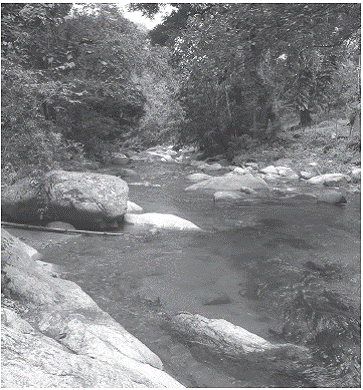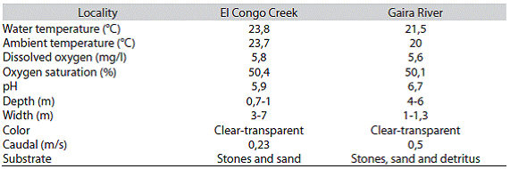 Distribution and ecological notes: This species is so far known from the upper Gaira and Río Frfo drainages, in the Sierra Nevada of Santa Marta, Caribbean coastal drainages of northern Colombia (Figure 3). Hemibrycon sierraensis was captured in streams characterized by rela tively rapid water current, running over rocky and sandy bottoms with high transparency (Figure 4). The pH was near neutral, dissolved oxygen and percent saturation of oxy gen values were high (Table 2) typical of oligotrophic en vironments. The new taxon is allopatric with Hemibrycon santamartae, a species found in the more eutrophic wa ters of the Rancherfa River and its tributaries. Analysis of stomach contents of four specimens revealed pres ence of filamentous algae, fragments of vascular plants, adults and larvae of two different species of Trichoptera (Hydropsychidae), adult Formicidae and fragments of unidentified arthropods. The presence of allochthonous and autochthonous items suggests that this species is omnivorous.