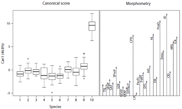 We performed a canonical discriminate analysis on the covariance matrix of morphometric characters with the software program R version 2.15.3 (available free at the website http://cran.r-project.org/bin/windows/base/). The Burnaby method to eliminate the influence of over all size, with the Past program, version 3.0 for Windows.