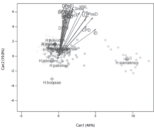 Comments: A discriminant analysis that included species from adjacent watersheds did not distinguish among most species based on morphology, but did separate Hemibrycon sierraensis. H. sierraensis is distin guished from H. boquiae, H. colombianus, H. santamartae, H. dariensis, H. cardalensis, H. metae, H. palomae, H. poly-odon, and H. jabonero along canonical axis one by differ ences in interorbital distance, postorbital distance, head length and caudal peduncle depth (Figure 5). The first ca nonical axis explained 46,8% of the total variability and the second 19,8%, between the first and third canonical axis explained the 81% of the variation (Figure 6).
