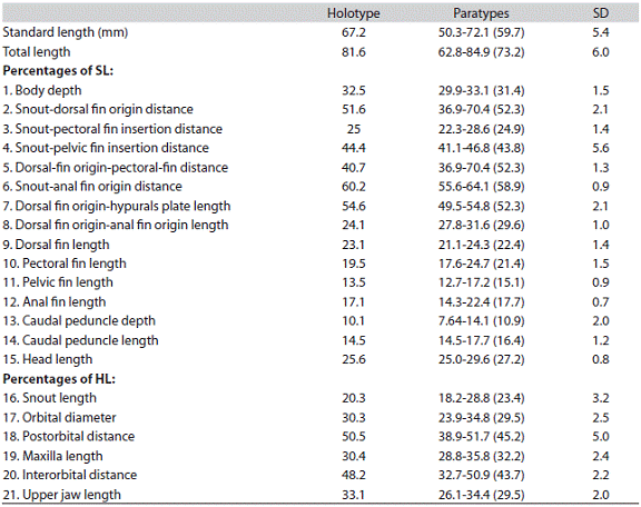 Description. Morphometric data are in Table 1. Body slender and elongate (mean maximum body depth 31.4% SL). Area between orbits slightly convex. Dorsal profile of head straight to supraoccipital, then slightly convex from supraoccipital to dorsal origin and from last dorsal-fin ray to caudal peduncle, then straight to base of caudal fin. Ventral profile of body convex from snout to base of pelvic fin, oblique along anal-fin base, then straight to base of caudal fin. Head and snout large, mandibles equal; mouth terminal, lips soft and flexible, not covering outer row of premaxillary teeth; ventral border of upper mandible oblique; posterior edge of maxilla reaching anterior edge of orbit; opening of pos terior nostrils vertically ovoid.
