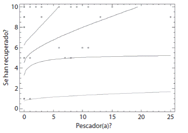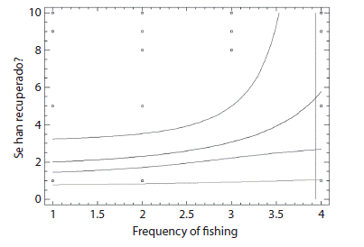 =6.6; F=2.43; df=1. 43; P=0.12; Fig. 1). A strong positive relationship showed the longer a Tárcoles fisherman or woman has fished, the more they believed shrimp resources have recovered (F=4.04; df=1, 43; P=0.05; Fig. 2). Another strong, positive relationship showed that Tárcoles women who have fished more recently (this year or in the last 5 yrs) had a perception of greater shrimp recovery than those that no longer fish (more than 5 yrs ago or never)(F=4.91; df=1, 34; P=0.03; Fig. 3). Those in Tárcoles who thought that more shrimp had recuperated did not necessarily like to fish more than those who thought less shrimp had recuperated (F=1.29; df=1, 34; P=0.26; Fig. 4).