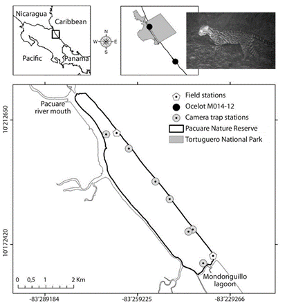 The distance covered by the ocelot M014-12 (41km, approximately) is comparable to that described in the literature (Crawshaw, 1995; Jacob, 2002; Booth-Binczik, 2007). As Tortuguero National Park and Pacuare Nature Reserve are not connected through a continuous forest, it is unclear the dispersal route utilized by the felid. However, one can presume that the ocelot travelled through the fragmented landscape (dominated by agriculture fields and human settlements) using the remaining forest patches along the Caribbean coast. This record constitutes the first evidence of wildlife movement between Tortuguero National Park and Pacuare Nature Reserve, and enhances the importance of corridors for the long-term conservation of the species.