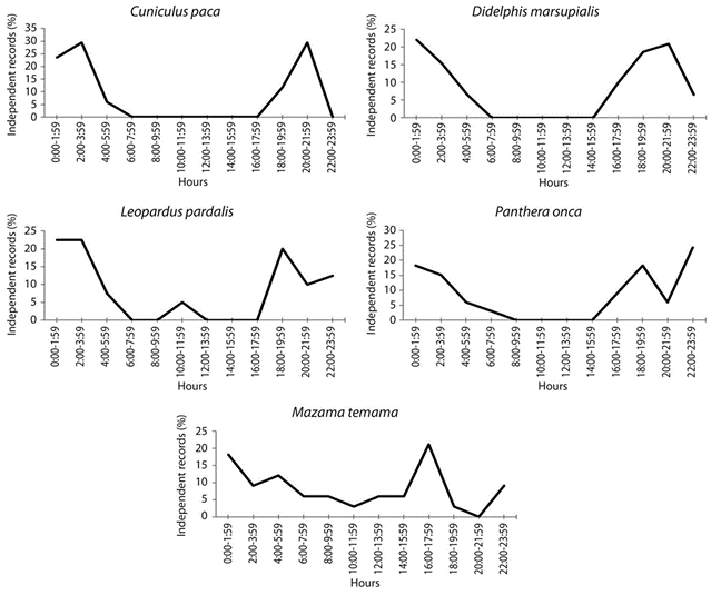 Activity patterns were estimated for five species of mammals (Fig. 2). Our results suggest that the jaguar (P. onca), the ocelot (L. pardalis), the common opossum (D. marsupialis) and the spotted paca (Cuniculus paca) are mainly nocturnal, while the red brocket deer (Mazama temama) was classified as diurnal and nocturnal.
