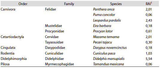 According to the ‘relative abundance index’, the most abundant mammalian species were the common opossum (D. marsupialis) and the ocelot (L. pardalis), while the puma (P. concolor) and the Northern tamandua (Tamandua mexicana) were the least abundant species recorded in the area, respectively (Table 1).