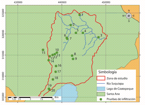 Escogimos 3 de los métodos más utilizados para la determinación de la velocidad de infiltración en el campo y los aplicamos en 20 puntos seleccionados de la cuenca, los sitios los escogidos en función del tipo de uso de suelo (Fig. 1).
