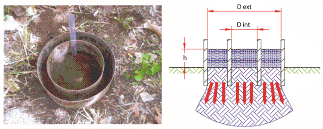 Método de doble anillo: según Selker et al. (1999), el método del doble anillo es la prueba más común para la estimación de propiedades hidráulicas del suelo. Horton (1939), estableció, para el caso de un suelo sometido a una precipitación con intensidad siempre superior a la capacidad de infiltración, una relación empírica para representar el declive de la infiltración con el tiempo puede ser presentada de la siguiente forma: