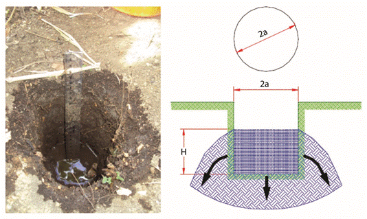 Método del permeámetro de Guelph: es una modificación del permeámetro presentado por Talsma y Hallam (1980). Este permeámetro consiste en un Mariotte construido con dos tubos intrínsecos que actúan como depósito manteniendo la carga hidráulica constante en un hoyo practicado en el suelo. Determinando el valor de conductividad hidráulica saturada en campo por medio de un procedimiento numérico, a partir de mediciones de velocidad de flujo infiltrándose en estado estacionario.Los modelos analíticos que representan el flujo a través de un pozo o agujero de infiltración en régimen permanente desde un pozo de radio a y altura de agua constante “H”, en un medio poroso, rígido, semi-infinito, homogéneo e isotrópico, se deducen a partir de la ley de Darcy, ya sea en un suelo totalmente saturado o no, considerando que pueden intervenir distintos tipos de flujo (Fig. 2).