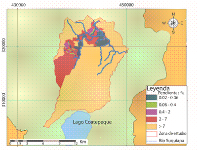 Para el cálculo del balance hídrico de suelos se siguió el método de Schosinsky (2006), para ello se generaron mapas de los distintos parámetros, donde se presentan los de uso de suelo (Fig. 5) y pendientes (Fig. 6).