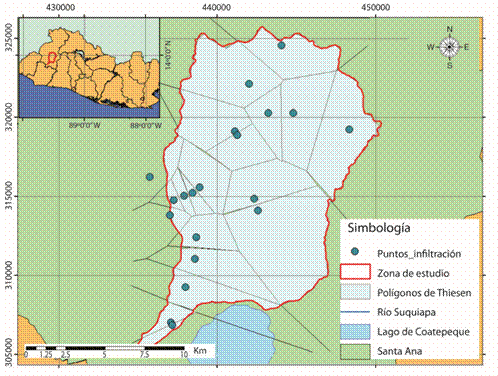 El área de la cuenca del río Suquiapa fue dividida en polígonos de Thiessen (Fetter, 2001, 1994) siguiendo los métodos propuestos para el balance hídrico de suelos de Schosinsky (2006), los cuales son ampliamente utilizados en todo Centroamérica y de uso obligatorio en Costa Rica (La Gaceta, 2010). Siguiendo estos métodos se calcula la recarga potencial al acuífero para un año promedio (con una discretización temporal mensual).
