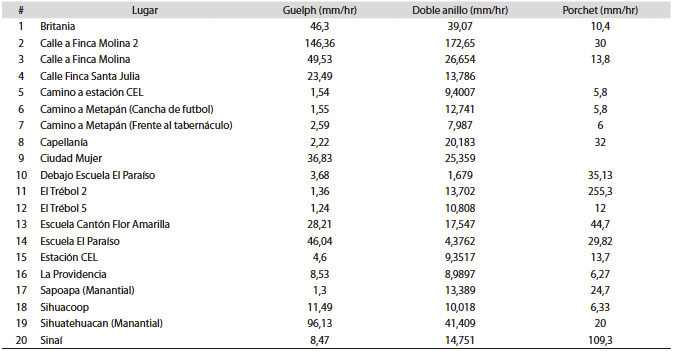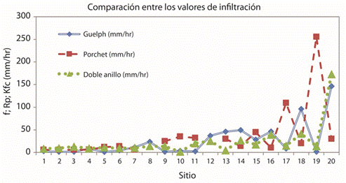 Los tres métodos analizados producen resultados muy similares cuando el resultado está asociado a valores pequeños de tasas de infiltración, mientras que, para valores de tasas de infiltración altos (mayores a 50 mm/hr), los resultados presentan una variación mayor entre los métodos para un mismo sitio (Fig. 8).