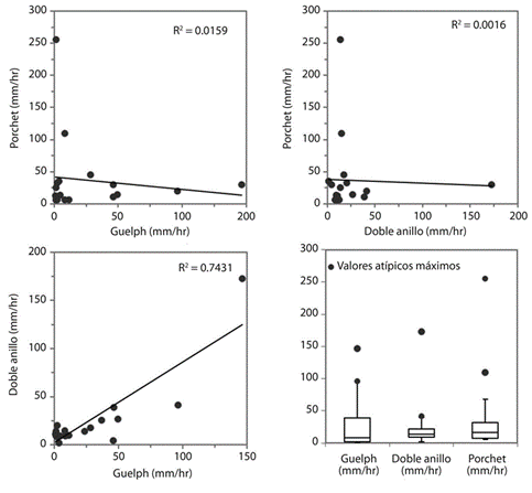 Al comparar entre métodos (Fig. 9), la mejor correlación se observa entre los métodos Guelph y doble anillo (r2=7,4x10-1), mientras que la correlación entre Porchet y Guelph (r2=1,6x10-2) es menor y aún más baja es la correlación entre Porchet y el método del doble anillo (r2=1,6x10-3), El diagrama de caja muestra la información sobre los valores mínimos, máximos, la distribución de los cuartiles 25%, 75% y la ubicación de los valores atípicos; en este diagrama se observa que el método de Porchet obtuvo el valor más alto, se nota además que el permeámetro de Guelph presenta los rangos más amplios de valores y el método del doble anillo tiene la menor variabilidad en general.