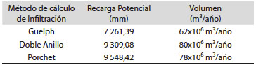 Por último, la recarga potencial obtenida por cada método, refleja significativas diferencias, ya que el Permeámetro de Guelph nos conduce al valor más bajo, tal como lo expresa García-Sinovas, et al. (2001). Los valores medios obtenidos con el permeámetro de Guelph fueron inferiores. Reynolds & Elrick, (1986) remarcan que el método del Permeámetro de Guelph está bien fundamentado teóricamente, aunque carece de una verificación de campo, pero que los resultados obtenidos hasta la fecha demuestran que son resultados alentadores. Dafonte, et al., (1999), comprobó que el método del permeámetro de Guelph es una técnica sencilla y rápida, en comparación de otros métodos de cálculo de infiltración. Prieto, (2006) concluye que el método de doble anillo obtuvo valores significativamente mayores que el método de carga constante. Finalizando que el valor de recarga potencial que se obtiene por los métodos de carga variable está influenciado mayormente por los macroporos, por lo que se comprenden que resultara en valores mayores, mientras que el método de permeámetro de Guelph, por lo microporos.