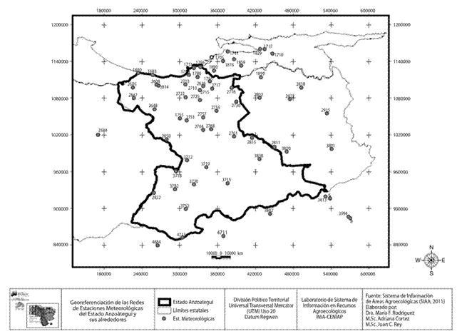 Para el desarrollo de este trabajo se dispuso de la información de precipitación mensual para el periodo 1970-2000 de 65 estaciones meteorológicas de las instituciones que manejan este tipo de información en el país, ubicadas en la Región Oriental de Venezuela, que comprende a los estados Anzoátegui, Bolívar, Guárico, Monagas y Sucre (Fig. 1).