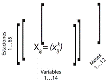 Cada tabla posee la información de las estadísticas descriptivas del periodo 1970-2000. Adicionalmente, están geo-referenciadas por la latitud, longitud y altura. La Figura 2 muestra la estructura de los datos. De esta manera, es posible obtener una estructura media de cada observación a lo largo de los meses, clasificar las estaciones y determinar cuáles son las relaciones entre las estaciones y las distintas variables.