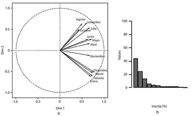 La proyección en el espacio euclideano de la estructura de correlación vectorial de las tablas es óptima y los dos primeros componentes explican más del 60% de la variabilidad total; además muestra dos grupos de meses: de noviembre a marzo y de abril a octubre, lo que se corresponde con estación seca y lluviosa respectivamente (Fig. 3). Adicionalmente, el periodo de mayor peso en la conformación de la estructura compromiso está representado por los meses de diciembre a marzo.