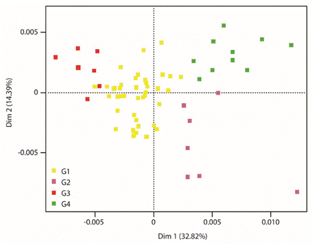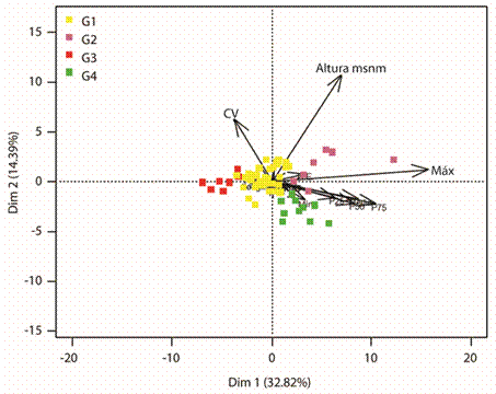 Por último, el G4 abarca aquellas estaciones con montos elevados de lluvia (1 200-1 800mm), generalmente son lluvias de origen orográfico las que se presentan en el estado Monagas y lluvias debido a la influencia de la Zona de Convergencia Intertropical (ZCIT) en el estado Bolívar, correspondiente a zonas subhúmedas de trópico bajo. Se caracterizan por tener altos patrones de lluvia, por lo que se puede concluir que la primera dimensión separa estaciones con mayores y menores regímenes de lluvia; las del G3 son las de menores montos de lluvia, es decir son zonas secas.