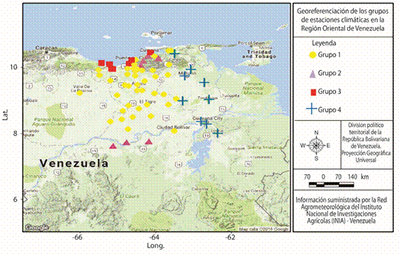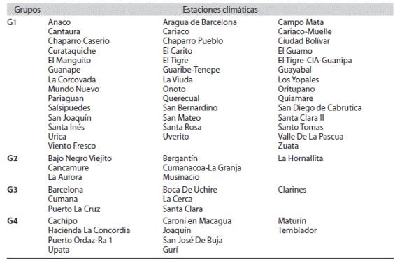 El mapa muestra la espacialización de los grupos de estaciones definidos en el estudio (Fig. 6). Las estaciones climáticas cuyos valores más bajos se ubican en la zona noreste del estado Anzoátegui y parte de Sucre; se incrementan hacia el sur de la región.
