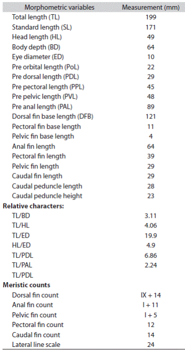 A single specimen two-spot razorfish, Iniistius bimaculatus, were collected (Fig. 1) of 199 mm in total length (TL) from Digha landing centre (21º36’ N and 87º32’ E), West Bengal, India caught by a commercial trawl at about 21 meters of depth. The original colouration of live specimens was recorded on photographs. Taxonomic identification of the specimens was based on Froese & Pauly, 2013; Gomon & Randall, 1984; Randall, 1995; Sommer et al., 1996; Paolo & Randall, 2000; Randall & Earle, 2002. Measurements and counts of the examined specimens follow Holden & Raitt (1974) and Hubbs & Lagler (1964). All the measurements are done by Mitutoyo digital caliper to the nearest 0.01 mm (Table 1) and photograph are taken Sony DSC-W800 camera. The presently illustrated specimen were preserved in 10% formaldehyde and deposited in the Museum of ICAR-Central Institute of Fisheries Education, Kolkata Centre (CIFE/KOL/ MW/F-0222, Collected by: Mr. Alakesh Pradhan and Dr. B. K. Mahapatra, Col.09.04.16). Morphometric ratios and meristic counts of the specimen are given in the description section.