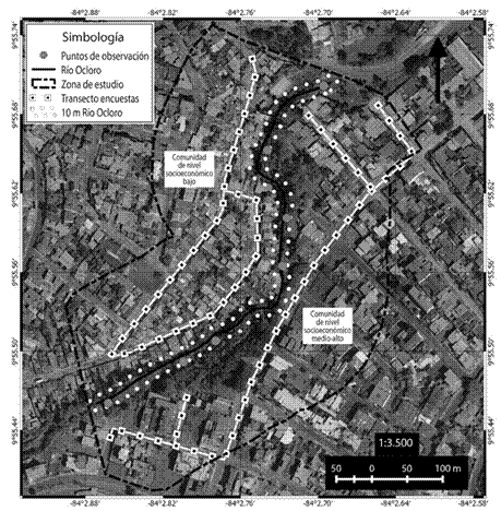 Área de estudio: El estudio lo realizamos de setiembre del 2012 a abril del 2013 en la principal zona urbana de San José, Costa Rica. El área de estudio está ubicada en la depresión intermontana central en los márgenes del río Ocloro a 1200 msnm (Fig. 1). En este punto, el río separa dos comunidades urbanas: Barrio Pinto de nivel socio-económico bajo y Residencial El Prado de nivel socioeconómico medio-alto (Apéndice digital 1) (Ministerio de Vivienda y Asentamientos Humanos [MIVAH], 2011; Instituto Nacional de Estadística y Censos [INEC], 2012).