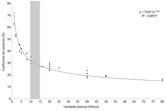 Con los datos que se muestran en el cuadro 1 se construyó un gráfico de dispersión (Fig. 1) donde los puntos colocados en la abscisa fueron los correspondientes al número de unidades básicas, mientras que los puntos colocados en la ordenada fueron los correspondientes a los coeficientes de variación para cada tamaño. Se omitieron los tamaños superiores a 80 unidades básicas para poder apreciar mejor el comportamiento de la curva.