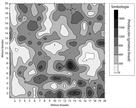 Con el programa de cómputo Golden Software Surfer© se construyó un mapa de contorno (Fig. 2) para lo cual se utilizó la variable producción en gramos.