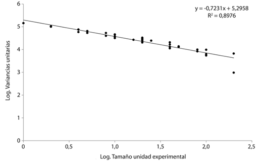 La regresión entre los logaritmos de los tamaños de parcela contra los logaritmos de las variancias unitarias derivó en el siguiente gráfico (Fig. 3).