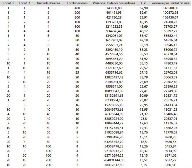 Análisis de datos: Se programó una hoja electrónica utilizando el programa Office Excel (Microsoft Corporation©), donde se ingresaron todos los datos correspondientes a la producción de cada unidad básica y se calculó: la variancia y el coeficiente de variación (C.V.) para cada una de las posibles formas y tamaños de unidades experimentales (llamadas también: unidades secundarias) que se obtuvieron por medio de la combinación de las unidades básicas. Se partió de una sola unidad básica hasta llegar a una parcela del tamaño de todas las unidades básicas unidas.