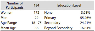 In total, 194 surveys were conducted, and 5 interviews were given, 4 to patients and 1 to a medical practitioner. Of these surveys, 172 women and 22 men were surveyed. The age range of respondents spanned from 18 to 75 years, with a mean age of 36 years (Table1). Of the 172 women surveyed, 73,8% worked in the home or as homemakers. The average time of arrival to the clinic was between 30 - 45 minutes, and the majority arrives by bus (79%). 96% of the surveyed population had a basic level of education (Table 1). Basic education in this paper is defined as having completed Primary education or higher, such that the patient can read and write proficiently. 84% of this population has insurance, and 16% does not have insurance. These groups were evaluated separately during data analysis because this separation is indicative of access to health care. If this percentage were extrapolated to the total population of Tirrases, theoretically 2 560 individuals would be without health insurance.