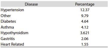 Patients reported frequent use of natural medicine (Fig. 2 in digital Appendix), and the uninsured group reported a 5% higher rate of use of this kind of non-traditional medicine. 27% of the insured population reported not taking prescribed medications from their doctor, while taking non-prescribed medications. The insured group visits the doctor more frequently than their uninsured counterparts (Fig. 3 in digital Appendix). Insured patients seek out medical advice only from their doctors, whereas the uninsured group seeks medical advice from family members most often (Fig. 4 in digital Appendix). The most reported chronic illnesses across the population were hypertension, diabetes, and asthma (Table 2), and had much higher incidences than literature reports of this area(Médica, et al., 2014). However, the uninsured group reported only asthma, gastritis, and allergies as chronic conditions.