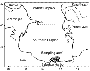 Sampling area: The sampling areas were in Iranian waters of the southern Caspian in Mazandaran province with the vessels of Babolsar Harbor (Fig. 1) in 52° 55” E and 36° 51”N. These vessels were equipped with cone nets and underwater electric lights. This research was conducted during a two-year period from January 2009 to December 2010 at depths of 70 to 100 meters and 2027 samples were collected. Species identification was aided using Macroscopic and morphologic characteristics key (Berg, 1948; Svetovidov, 1963).