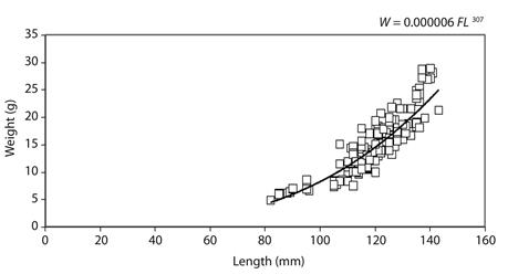 Sample analysis: In the laboratory, fork length (mm) was measured with a measuring board and body weight was measured using digital balance (nearest 0.1 g).