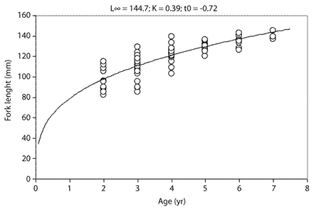 Von Bertalanffy growth parameters were similar both years with no significant difference. In 2009, bigeye kilka parameters were: L∞=145.1mm, k=0.37yr-1, t0=-0.63yr with the growth equation: Lt = 145.1[1-exp -0.37(t + 0.63)]. Parameters in 2010 were: L∞=144.7mm, k=0.39yr-1, t0=-0.72yr (Lt = 144.7[1-exp-0.39(t + 0.72)]) (Fig. 3).