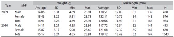 Average fork lengths of bigeye kilka in 2009 and 2010 were 120.06±11.95 and 119.12±13.42 mm and average weights were 14.91±5.28 and 15.17±5.24 g, respectively (Table 1).