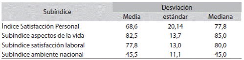Cálculo de los subíndices (dimensiones): se calculó el promedio de las respuestas a los ítems que conforman cada dimensión y el resultado fue multiplicado por 20 para obtener valores máximos de 100 en cada uno de los 3 subíndices: Aspectos de la vida, Satisfacción laboral y Ambiente nacional.