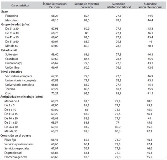 De acuerdo con los índices sociodemográficos, satisfacción personal, aspectos de la vida y aspectos laborales, los promedios de satisfacción son altos, más del 65%. Sin embargo el subíndice de ambiente nacional tiene una satisfacción media respecto a todos los grupos. Tanto hombres como mujeres presentan mayor satisfacción en aspectos de la vida y según el estado civil y el nivel educativo, que se comportan de igual manera de acuerdo con la antigüedad laboral y la condición del puesto (Cuadro 2).