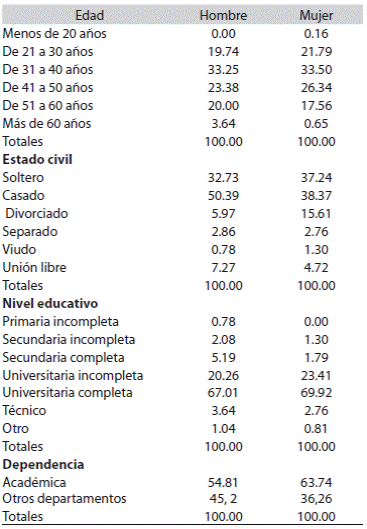 La distribución socio-demográfica se agrupa en dos grandes rangos de edad de 31 a 40 años y de 41 a 50 años. Respecto al estado civil un 50% de los hombres se encuentra casado, mientras que las mujeres un 38%. En el nivel educativo en ambos sexos más del 60% tiene universidad completa. Los mayores porcentajes de funcionarios que laboran para esta institución pertenecen a la parte académica (Cuadro 1).