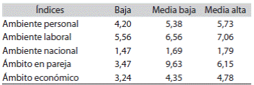 En los grupos en general se da un nivel bajo de satisfacción, por lo que se asignaron escalas de media alta, media baja y baja. En el ámbito de pareja los que tienen satisfacción media se encuentran más satisfechos en los demás aspectos de su vida con respecto a los otros grupos (Cuadro 2).