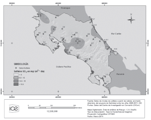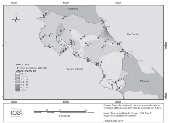 Adicionalmente se realizan mapas de los niveles de contaminantes (Cl- y SO2) en base a un estudio anterior realizado por el ICE (Proyecto de Salinidad) según la técnica de muestreo direccional de recolección de polvo, con base en la norma BS 1747, parte 5, la cual es asimilable a las técnicas de la ISO 9223. (Hall, Upton, & Marsland, 1993; BS 1747 part 5: 1972, Reapproved 1991)