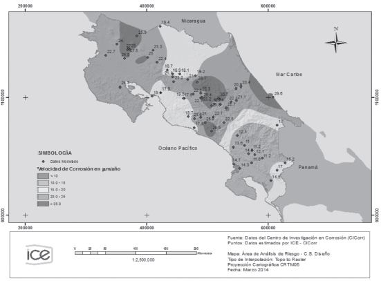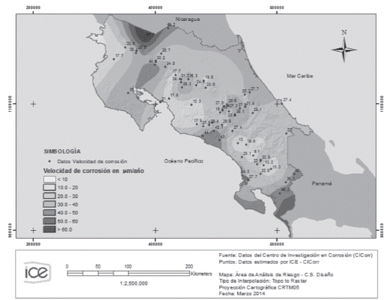 Los niveles de corrosión se encuentran entre 25 y 80µm*año-1 para todo el país, sin embargo en términos generales las regiones montañosas presentan los valores más elevados de corrosión, mientras que Guanacaste presenta los valores más bajos.
