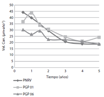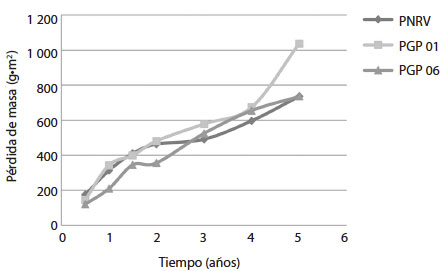 En tanto que el PGP 01, siendo el más expuesto a los vientos y lluvias, así como a la actividad de desarrollo del proyecto geotérmico, es el que presenta más variabilidad en los valores obtenidos de velocidad de corrosión o pérdida de masa por corrosión.