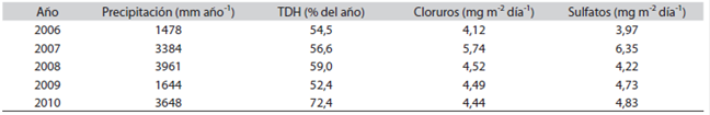 El valor promedio de pH de las lluvias fue de 5,8 por lo cual no se considera afectación por lluvias ácidas (Secretaria del Medio Ambiente, 2008; EPA, 2013).