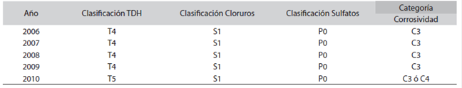 Estos parámetros plantean una atmósfera tipo rural o de baja contaminación, con una clasificación primaria, según la norma ISO 9223, de niveles de corrosión dentro de la categoría de corrosividad tipo C3 (media) para el acero, con valores de corrosión para el primer año del orden de (200 a 400) g m-2 año-1 ó (25 a 50) µm año-1.