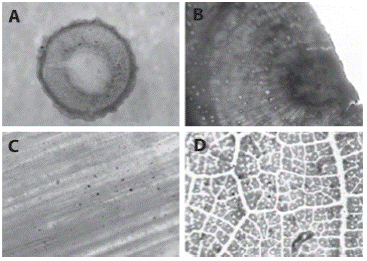 En la Figura 3 se presentan detalles anatómicos de la planta de Mora. En la Figura 3a se observa un corte transversal de un tallo joven que presenta: médula (en el centro), tejidos vasculares en forma de anillo (banda oscura y delgada rodeando el centro), córtex de parénquima (banda pálida subsiguiente) y corteza con principio de formación de corcho (banda oscura externa). La Figura 3b corresponde a un tallo maduro con crecimiento secundario donde puede observarse: médula de parénquima (en el centro), rodeado de xilema primario (banda delgada y oscura), a continuación se presenta madera formada por xilema secundario con rayos de parénquima (banda clara ancha), luego se encuentra una banda de crecimiento tardío de la madera (banda oscura). La Figura 3c presenta un corte longitudinal tangencial de la madera donde se observa el tejido xilemático. La Figura 3d es una vista a transluz del tejido laminar donde se observa el patrón de nervadura reticulado.