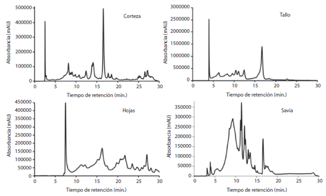 En este artículo se realizó un tamizaje cromatográfico con la finalidad de inspeccionar cada muestra del árbol de mora y determinar la posibilidad del aislamiento de algún posible metabolito secundario de interés. El Cuadro 1 muestra la cantidad de polifenoles que contienen diferentes partes del árbol donde la corteza y las hojas presentan una cantidad considerable de los mismos. En la Figura 4 se muestran los cromatogramas obtenidos con el equipo HPLC en fase reversa de las diferentes partes del árbol de mora. Se puede observar en todos los cromatogramas un pico con un tiempo de retención cercado a los 17 minutos, muy intenso en el cromatograma del extracto metabólico de la corteza del árbol de mora. Estos cromatogramas fueron obtenidos a 280 nm razón por la cual podemos asegurar que este pico se trata de un compuesto aromático y posible compuesto fenólico. Es interesante resaltar el cromatograma de la savia del árbol de mora el cual muestra una especie de montaña de picos alrededor de los 10 minutos indicando la posibilidad de la presencia en esta muestra de polímeros fenólicos conocidos como proantocianidinas. Además, el cromatograma de la savia muestra una serie de picos adicionales entre los 11 y los 15 minutos, que igualmente se podrían tratar de compuestos fenólicos.
