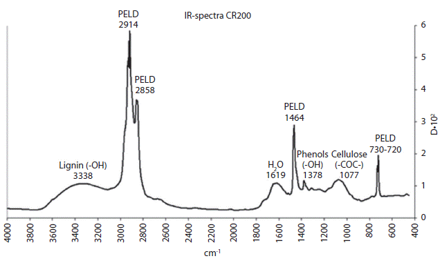 A partir del espectro de infrarrojo del material compuesto, Figura 6, se puede observar la presencia de ligninas, fenoles y celulosa provenientes del material de relleno.