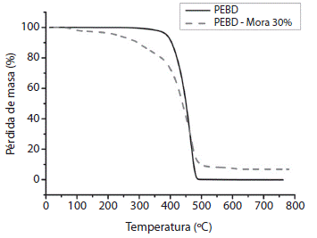 El TGA del material compuesto que contiene el árbol de mora-PEBD muestra que la masa inicialmente se mantuvo constante, con la esperada pérdida de humedad, hasta 200°C, luego cambia y disminuye. El material compuesto del árbol de mora-PEBD inicio su pérdida de peso aproximadamente a los 200°C y se descompuso aproximadamente a los 480°C similar que para PEBD puro. La temperatura, a la máxima velocidad de descomposición térmica de este material compuesto, es menor que la muestra pura, lo cual es de esperarse por la presencia del material de origen natural.