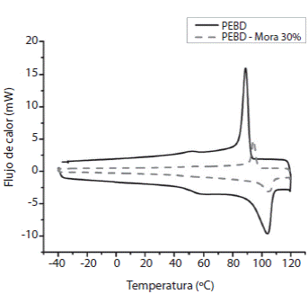 Como se puede observar en la Figura 8 los dos materiales muestran la aparición de los picos característicos de los procesos entálpicos asociados a la cristalización y la fusión. En ambos casos se muestra un marcado efecto debido a la presencia del árbol de la mora en la matriz polimérica. El sustrato natural disminuye la cristalinidad del material polimérico y aumenta la temperatura a la cual este hecho ocurre. Asimismo, la fusión del material se ve afectada por la presencia del árbol de la mora. La fusión ocurre a temperaturas menores en el material puro y la entalpía asociada es mayor, por su mayor grado de cristalinidad.